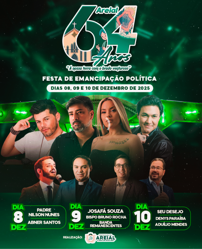 Areial completa 64 anos de emancipação política e a cidade vai celebrar com três dias de eventos, de 8 a 10 de dezembro de 2025. A programação inclui shows e apresentações para toda a comunidade.