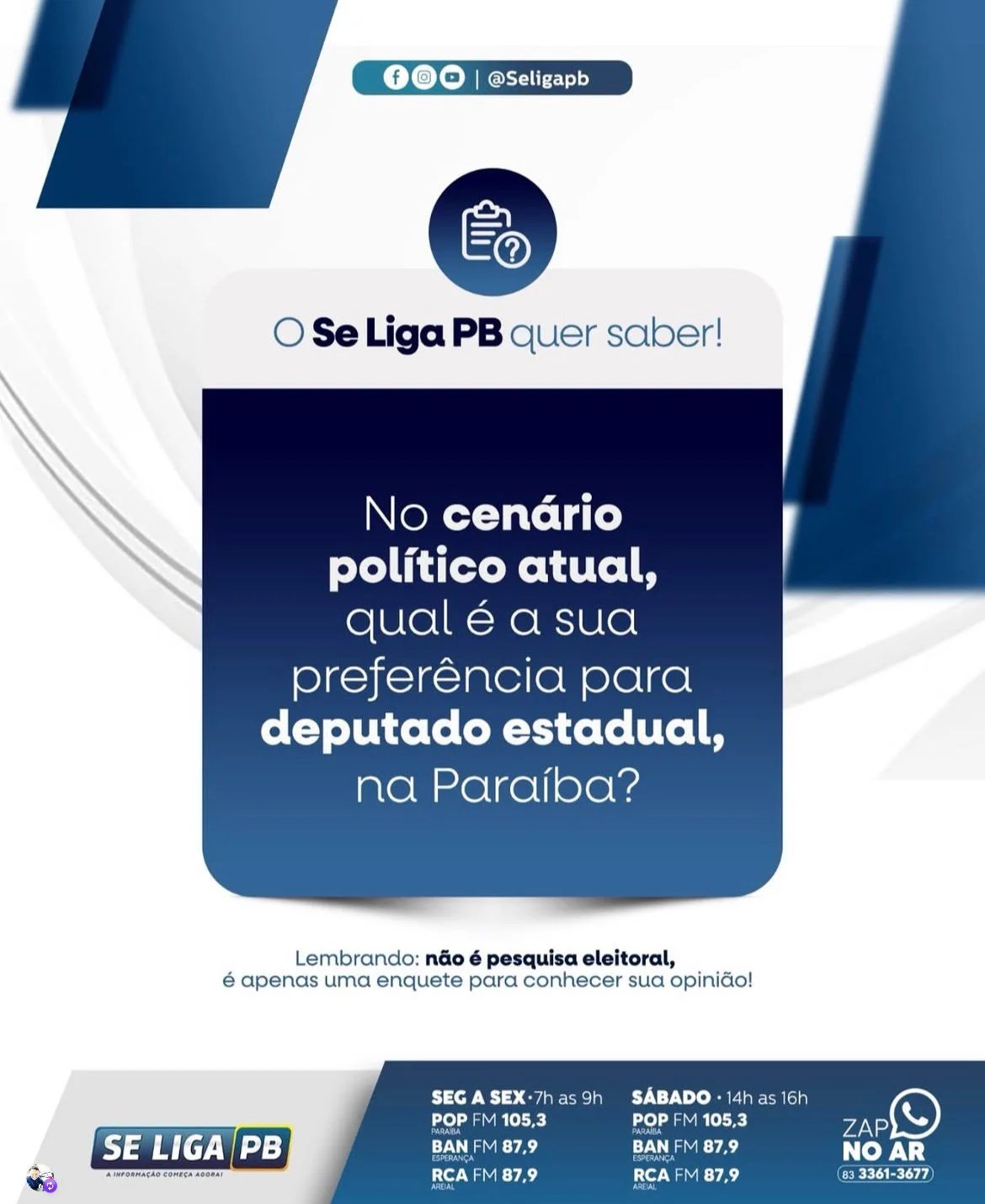 O Programa Se Liga PB realizou uma enquete no Instagram e questionou: No cenário político atual, qual é a sua preferência para Deputado Estadual na Paraíba? Foram citados 40 nomes diferentes. Os 10 primeiros mais votados, que totalizaram 1005 votos foram: 1- Maria Porto – 188 votos 2-Wilson Filho – 143 votos 3- Larúcia Sá […]