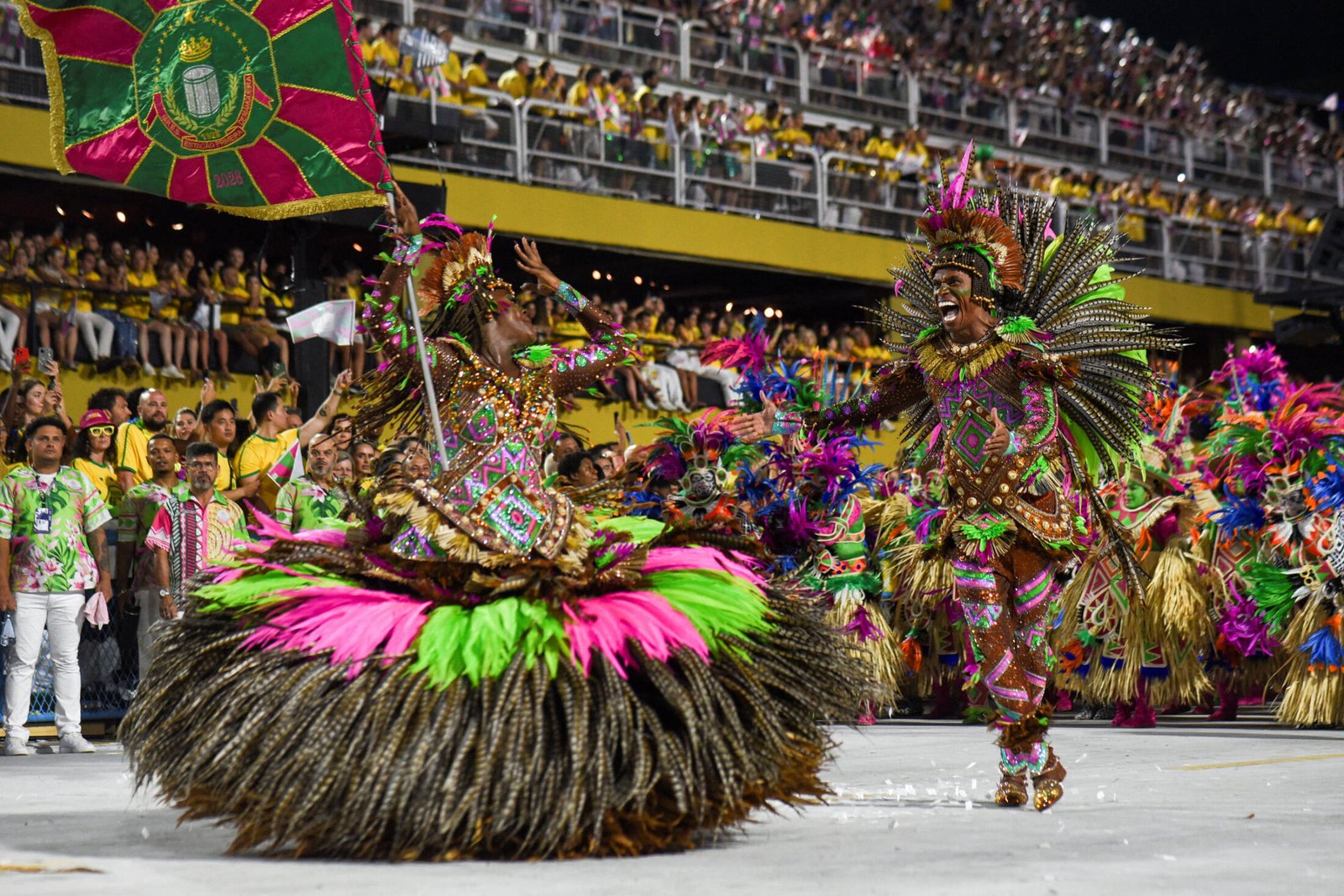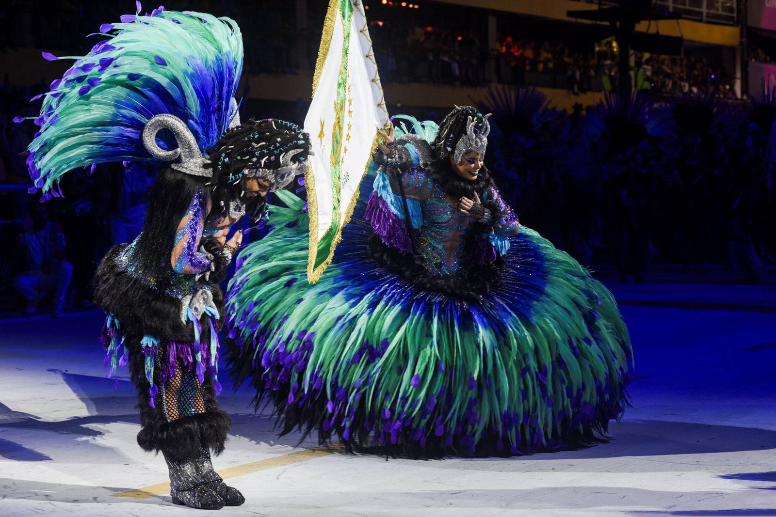 Casal de mestre-sala e porta-bandeira da Imperatriz Leopoldinense na primeira noite de desfiles do Carnaval carioca – Tita Barros/Reuters