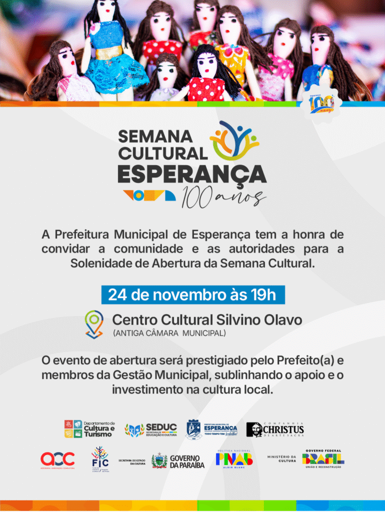 A Prefeitura Municipal de Esperança realiza, neste domingo, 24 de novembro, a solenidade oficial de abertura da Semana Cultural Esperança 100 Anos. O evento acontece às 19h, no Centro Cultural Silvino Olavo (antiga Câmara Municipal), e reunirá comunidade, autoridades e representantes de instituições parceiras em um momento dedicado à valorização da cultura local.