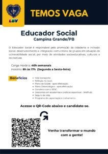 A instituição, reconhecida pelo trabalho social desenvolvido em Campina Grande e em todo o país, destaca que busca profissionais comprometidos e alinhados à missão de promover o desenvolvimento humano e a inclusão social.