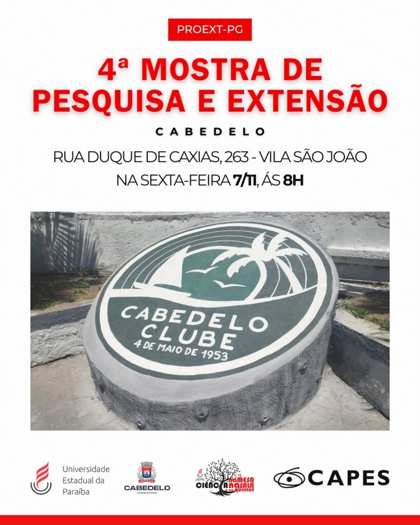 por Redação Se Liga PBO município de Cabedelo será palco, no próximo dia 7 de novembro, das 9h às 14h, da 4° Mostra de Pesquisa e Extensão realizada pelo Programa de Extensão da Pós-Graduação (PROEXTPG) da Universidade Estadual da Paraíba (UEPB). O evento acontece no Cabedelo Clube, espaço localizado no centro da cidade, e reunirá estudantes, professores e pesquisadores… Leia mais: 4 ° Mostra de Pesquisa e Extensão destaca a integração entre ciência e sociedade